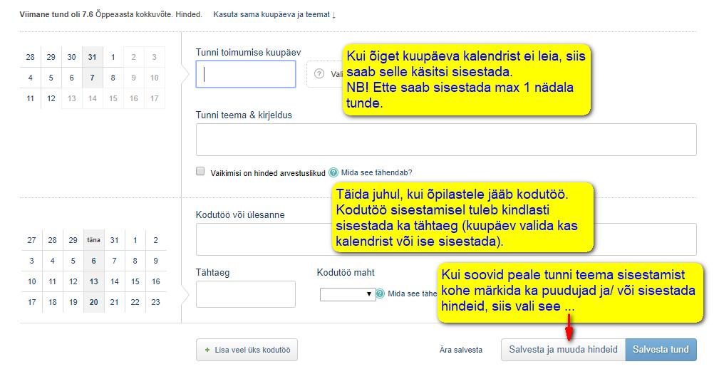 - Sisesta tunni kuupäev või vali see kalendrist, kirjuta tunni teema (soovi korral määra koduse ülesande sooritamise kuupäev ja sisesta kodune ülesanne) ja salvesta.